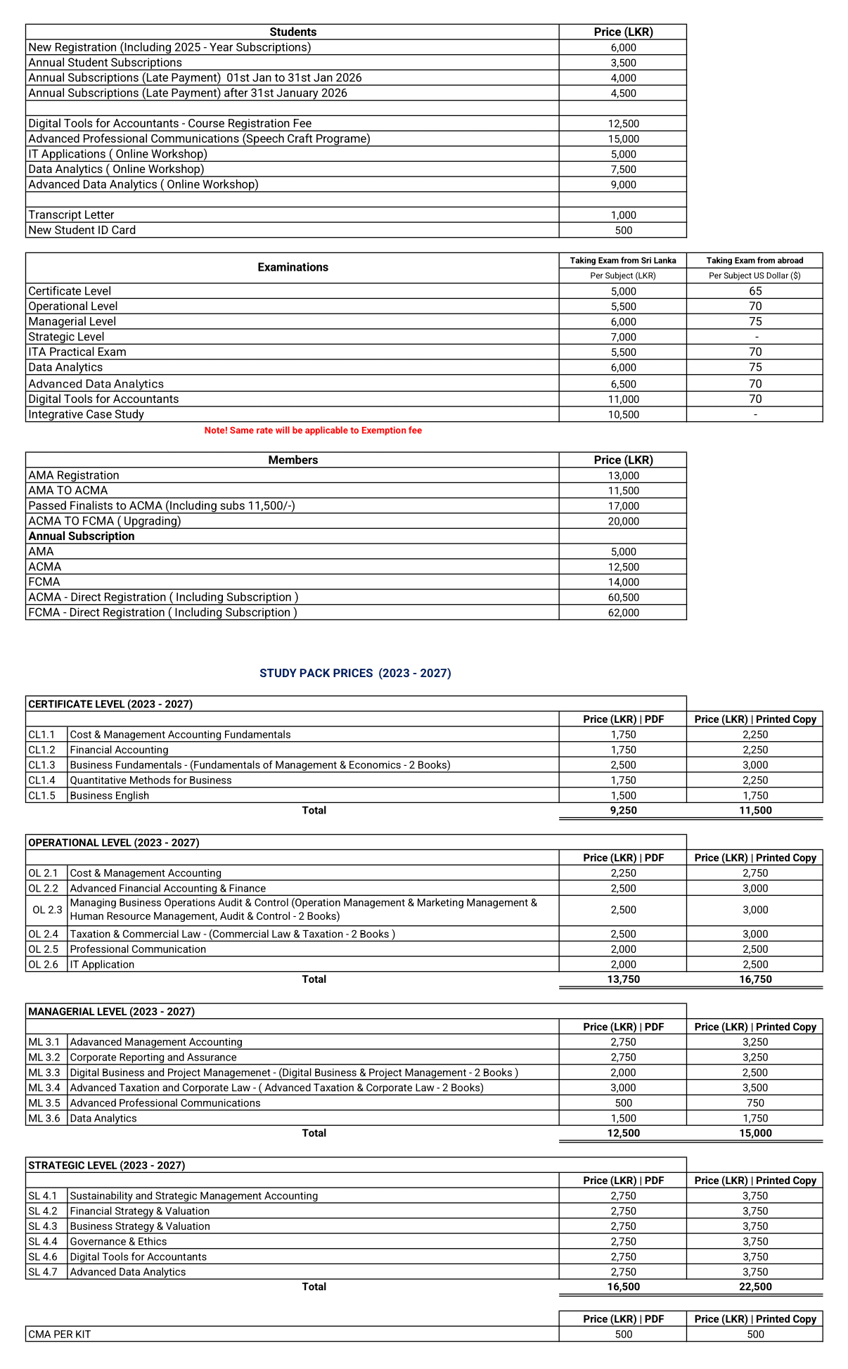 All payments are neither transferable no refundable. Prices Effective for year 2022, subject to change. Figurs in Sri Lankan Rupees