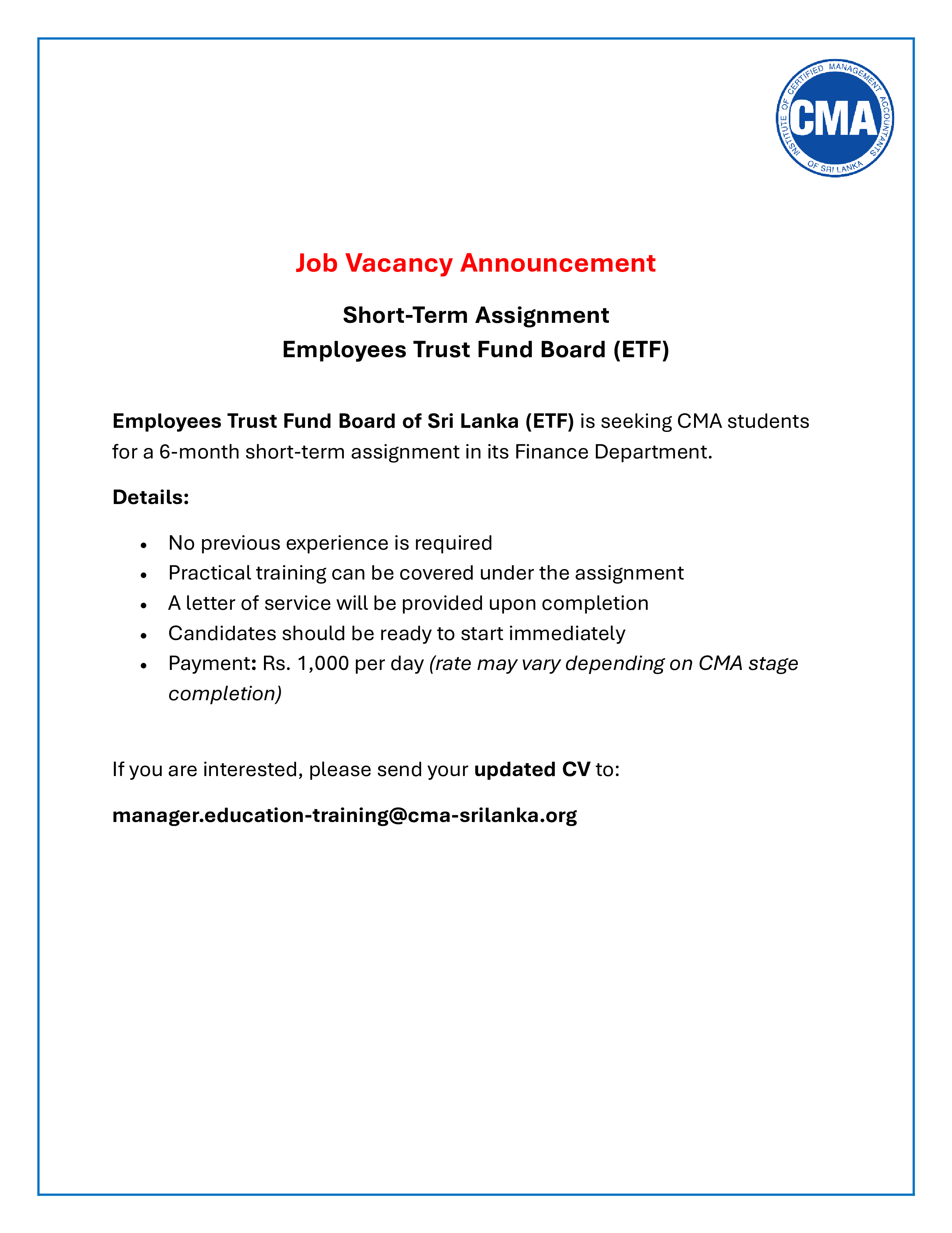Disclaimer: All vacancies listed above have been sent to the Job Bank by the relevant company/companies,and therefore should not be considered as an endorsement by CMA Sri Lanka.