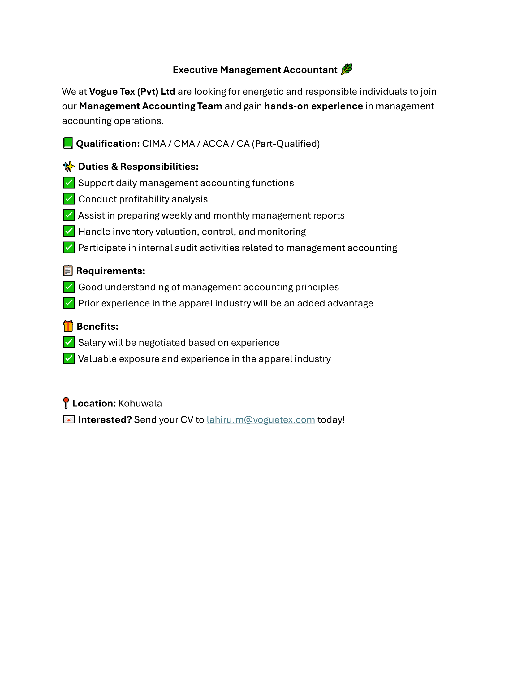 | Vogue Tex (Pvt) Ltd | Executive Management Accountant | 15-10-2025 | View |
